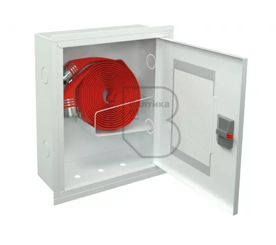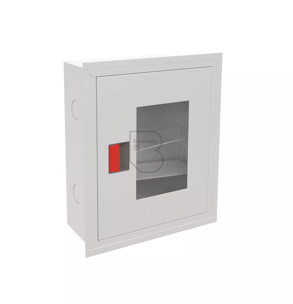 Дверца пожарного шкафа открывается на 160 градусов. Имеет запорное устройство в виде пластиковой защелки. На дверце имеется смотровое окно со вставкой из поликарбоната.