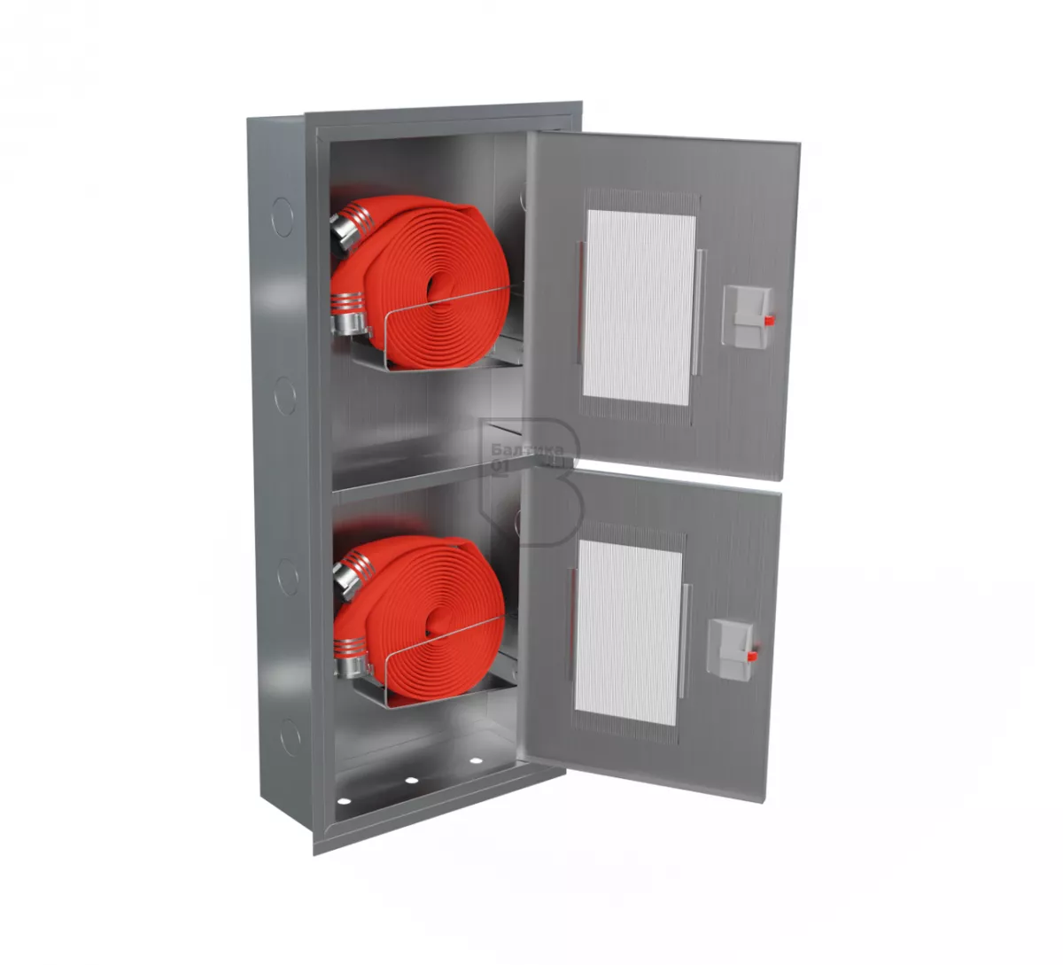 Дверцы пожарного шкафа открываются на 160 градусов. Имеют запорное устройство в виде пластиковой защелки.